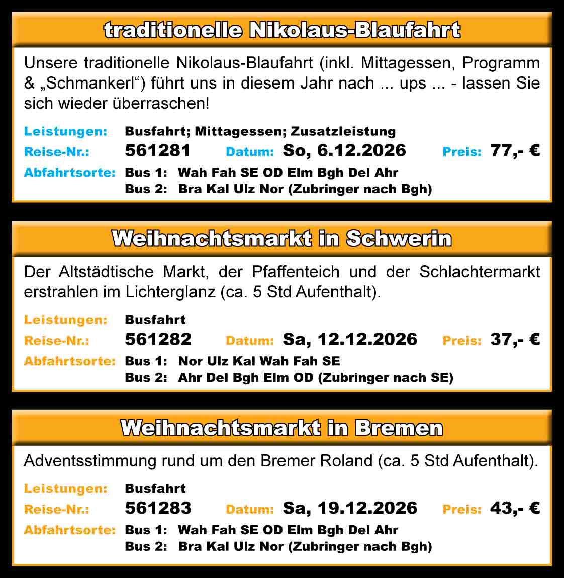 Tagesfahrten im Dezember Home § § § AGBs Tagesfahrten AGBs Pauschalreisen AGBs Busvermietung Impressum Datenschutz Info Busvermietung Reisebusse Reiseinformationen Abfahrtsorte Mitarbeiter Historie Katalog mit-reisen Travel GmbHNeuland 2a – 423795 Bad Segeberg, Germany (+49) 4551 / 96650 info@mit-reisen.com