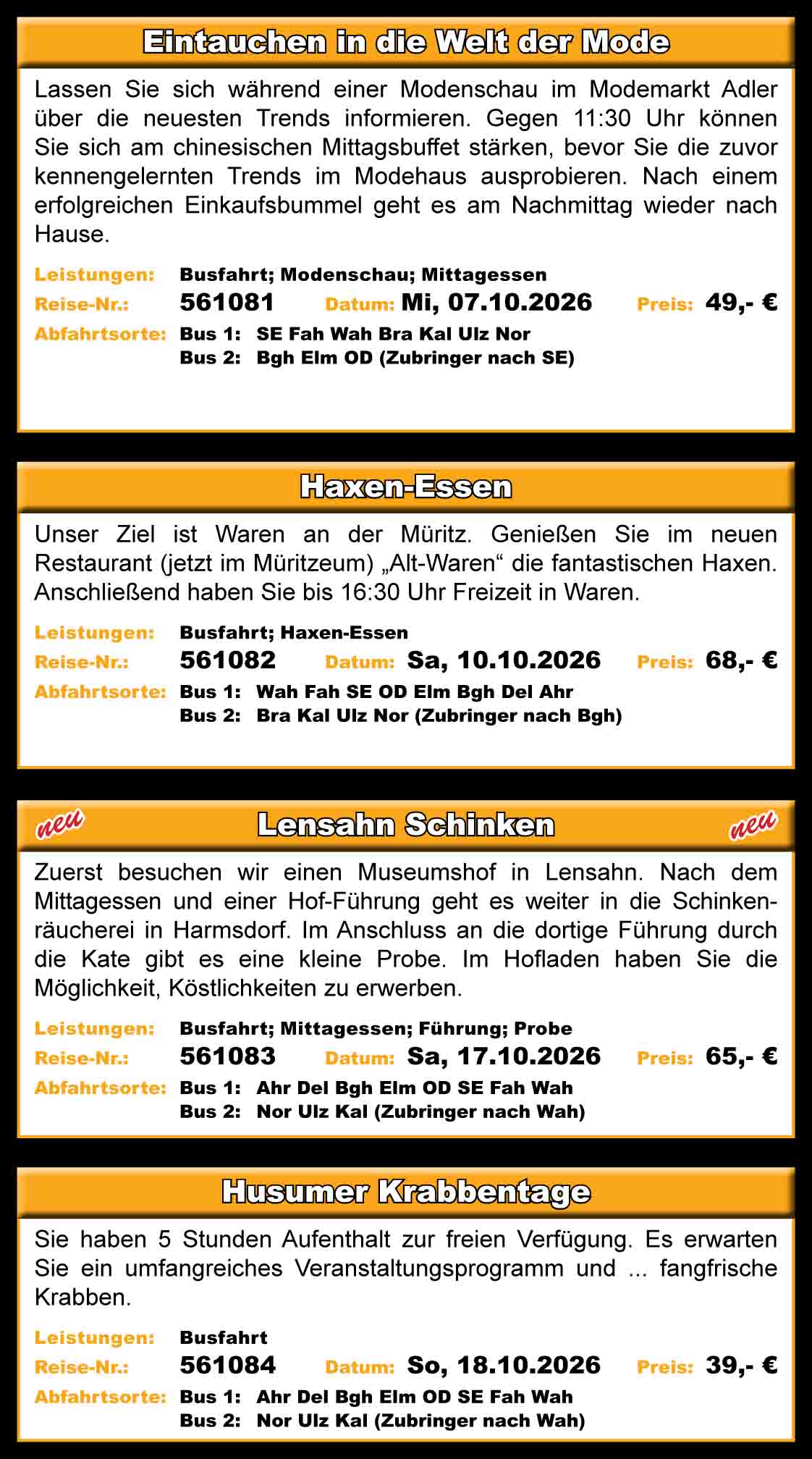 Tagesfahrten im Oktober Home § § § AGBs Tagesfahrten AGBs Pauschalreisen AGBs Busvermietung Impressum Datenschutz Info Busvermietung Reisebusse Reiseinformationen Abfahrtsorte Mitarbeiter Historie Katalog mit-reisen Travel GmbHNeuland 2a – 423795 Bad Segeberg, Germany (+49) 4551 / 96650 info@mit-reisen.com